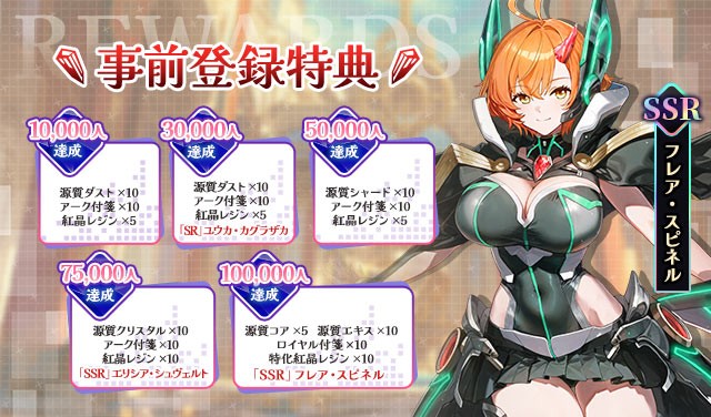 達成人数100,000人に到達したことで、「SR」ユウカ・カグラザカや「SSR」エリシア・シュヴェルト、「SSR」フレア・スピネルなどの豪華特典の全ての特典開放が確定した。