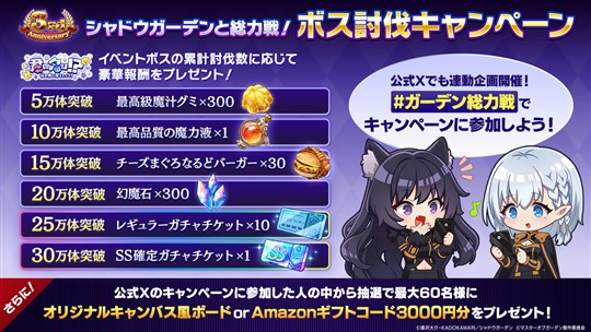 さらに、カゲマス公式Xではイベントボス討伐に連動した、フォロー&ハッシュタグキャンペーンを実施する。キャンペーンに参加してくれた人の中から抽選で最大60名様に、オリジナルキャンバス風ボードやAmazonギフトコードをプレゼント。