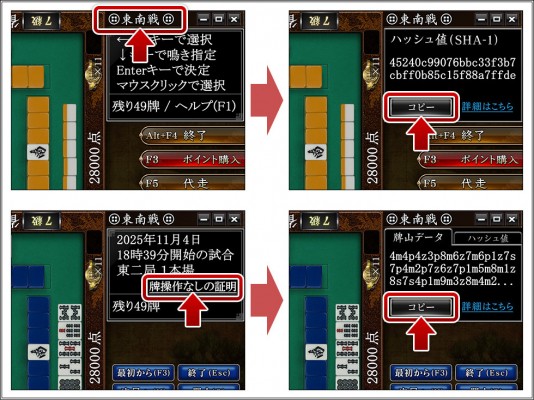 手順(1)で記録したハッシュ値と一致していれば、牌山データは局の開始時と終了後で変わっておらず、牌操作はないことが証明される。