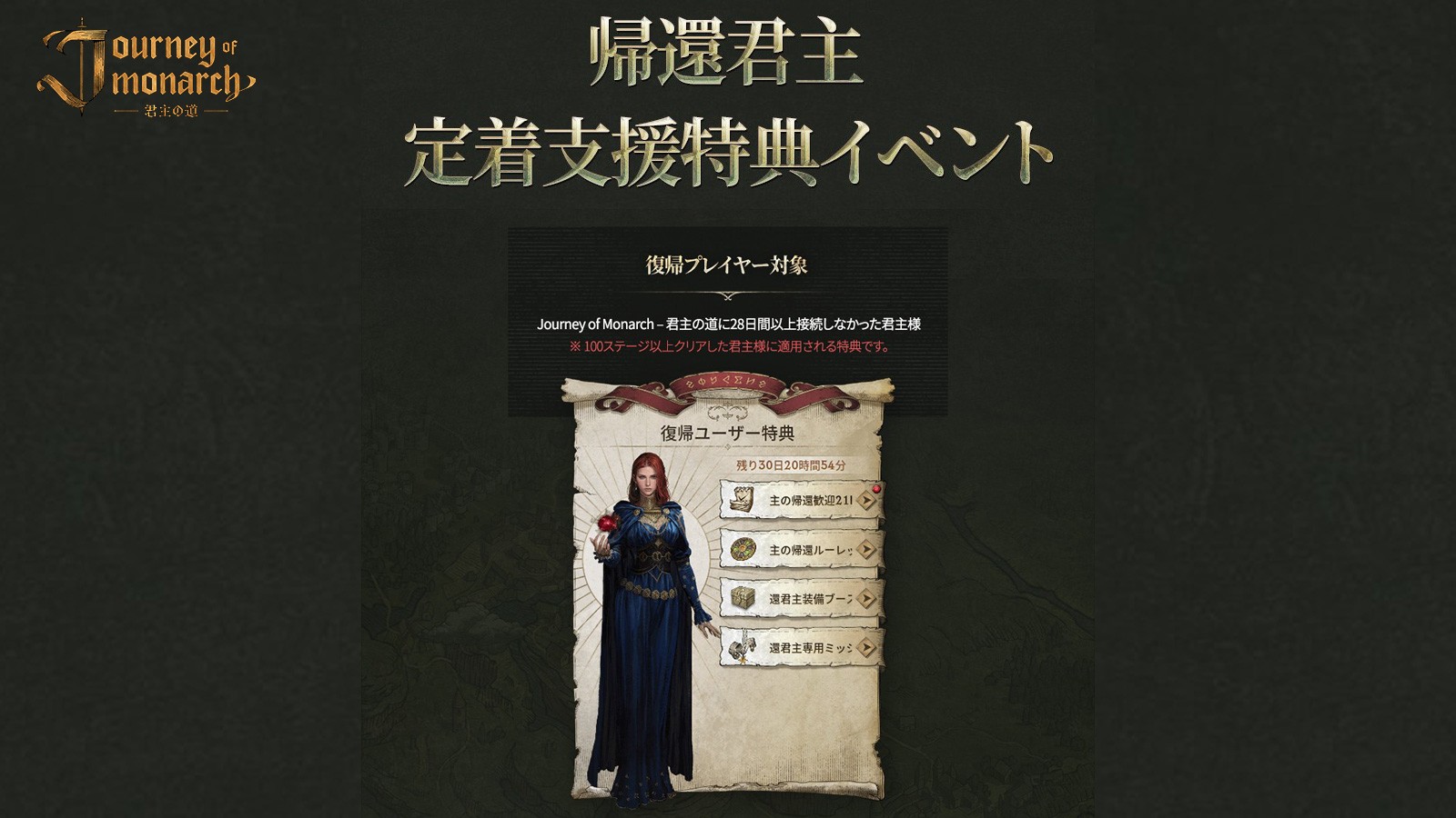「君主の道」への復帰を考える君主の皆様を対象とした「帰還君主定着支援特典イベント」を開催。