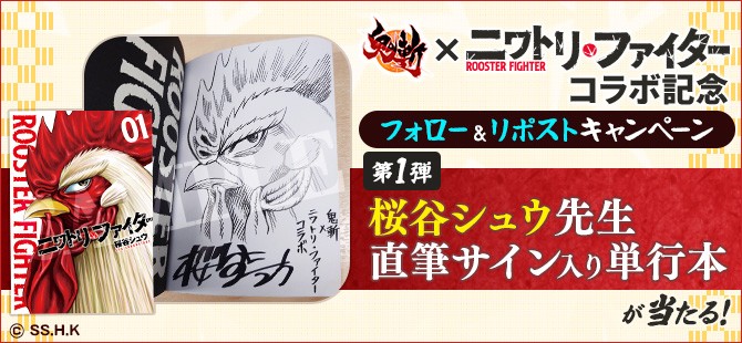 「ニワトリ・ファイター」の作画・原作を担当している桜谷シュウ先生の直筆サイン&イラスト入り第一巻単行本を抽選で3名様にプレゼントするフォロー&リポストキャンペーンを開催する。